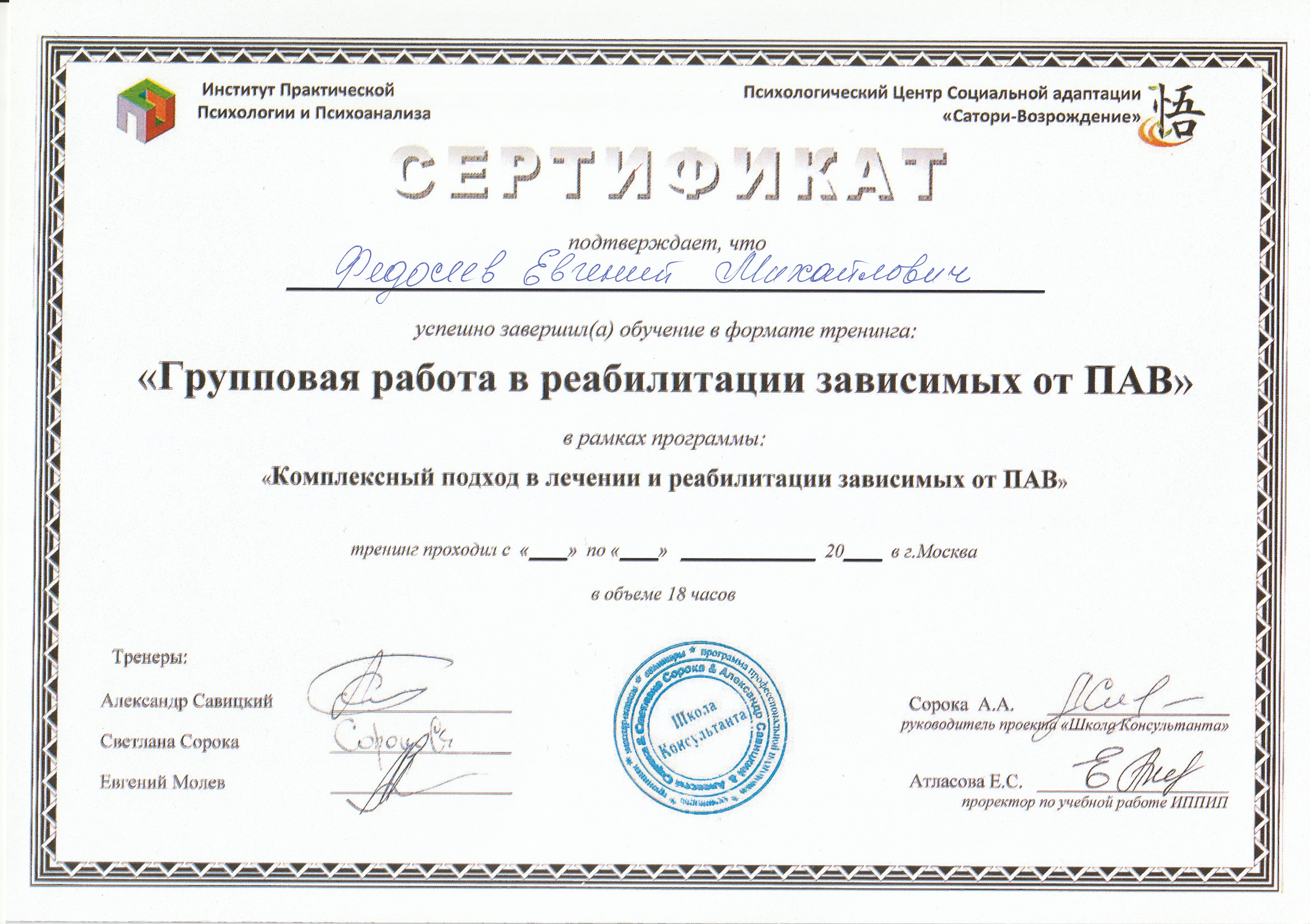 | Индивидуальный | Разрабатывается под конкретного клиента, исходя из его особенностей и потребностей для получения максимального результата. Индивидуальные консультации на протяжении всего срока реабилитации и социальной адаптации клиента. Включена индивидуальная работа специалистов с родственниками, семейные сессии. | 129 990 руб. |